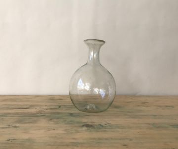 Bouteille à ventre rond avec une base surélevée. Cou long et grand avec un bord très légèrement évasé, se resserre légèrement près du ventre de la bouteille.