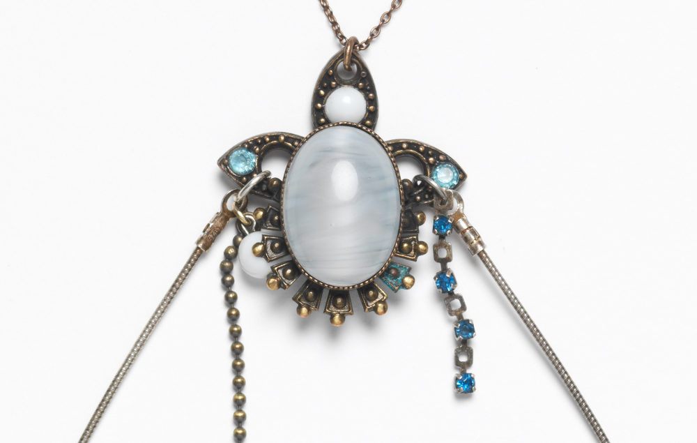 Vivant entre Athènes et Paris, elle est constamment à la recherche de matériaux vintage qu’elle combine pour créer des pièces uniques. Ces collages de bijoux génèrent une série de rencontres entre des matières précieuses, semi-précieuses et mondaines créant des manipulations poétiques et de nombreuses possibilités narratives.