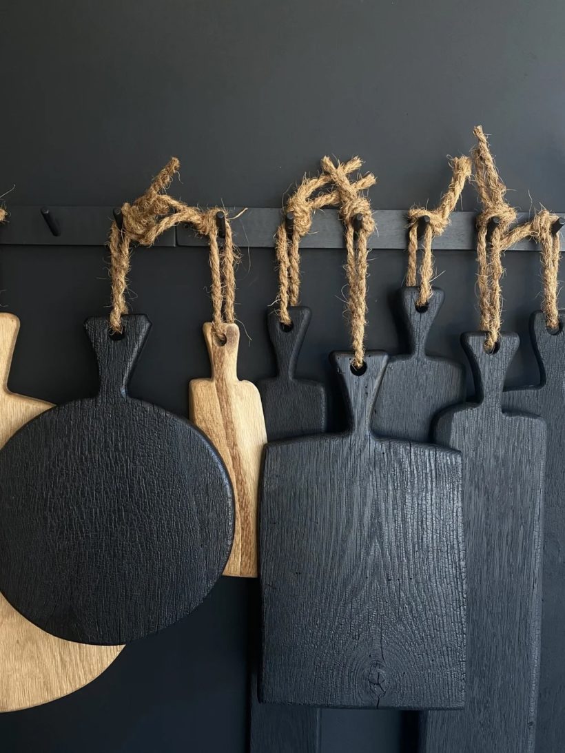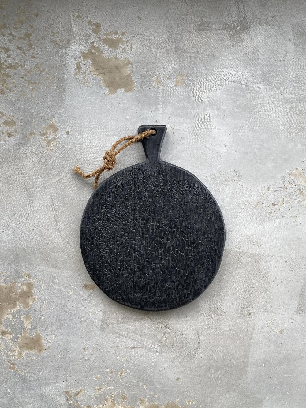 The Pizza Black Edition by Laura Living Style merges the rustic form of original Neapolitan pizza boards with the Japanese Shou Sugi Ban firing technique: Locally sourced oak is carbonized on the outside, which deeply densifies the fibers, making the material exceptionally durable and resistant to mold, moisture, weathering, and pests. The intense flames create a vibrant, completely black surface that accentuates the unique grain of each board and develops a beautiful patina over time.