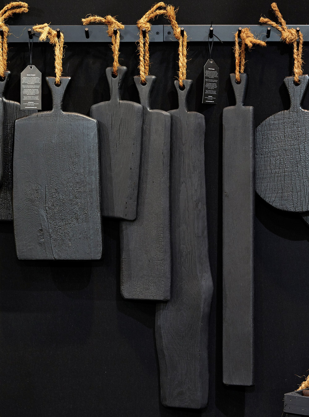 The Tapas Black Edition from Laura Living Style combines Japanese Shou Sugi Ban tradition with modern tableware design: Locally sourced oak is carbonized using a complex burning process, which deeply densifies the fibers, making them resistant to mold, moisture, weathering, and pests. The intense black color permeates the entire board, accentuating each individual grain pattern and developing a captivating patina over time.