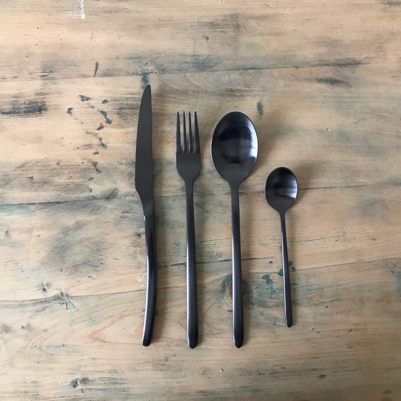 Black cutlery set in steel, composed of: 1 fork (20.6 cm) 1 knife (22.5 cm) 1 tablespoon (20.6 cm) 1 teaspoon or tea (14.5 cm)
