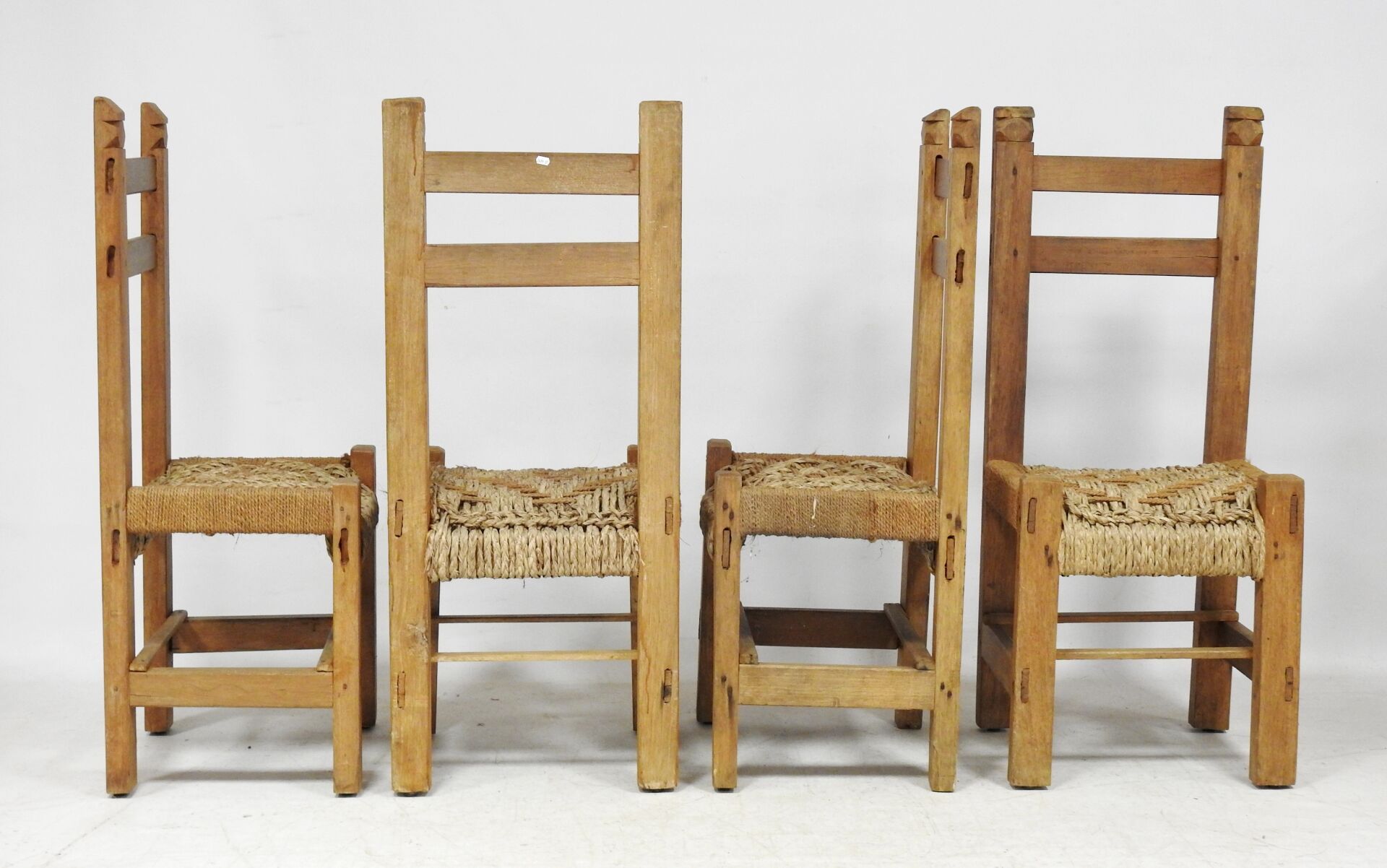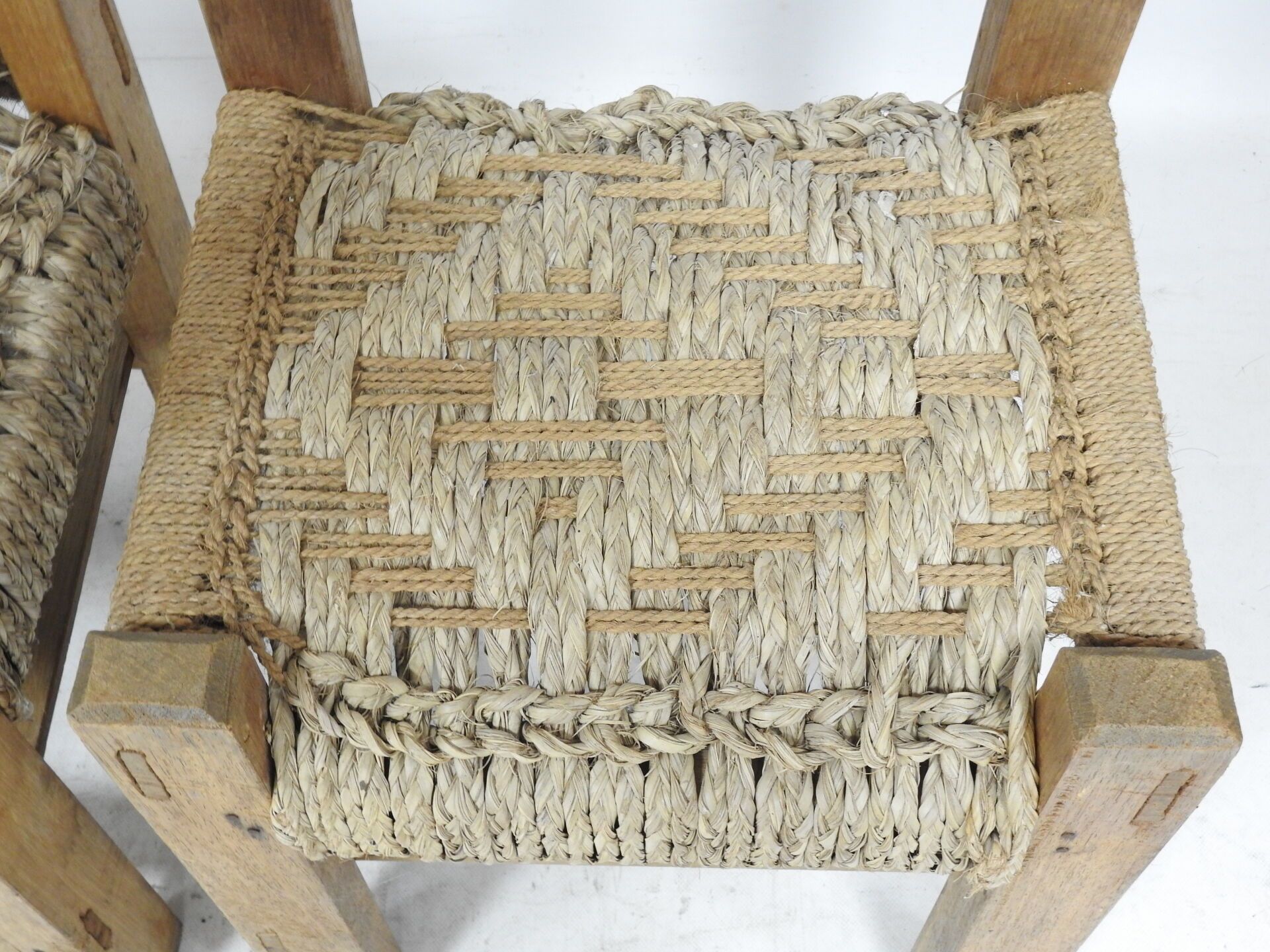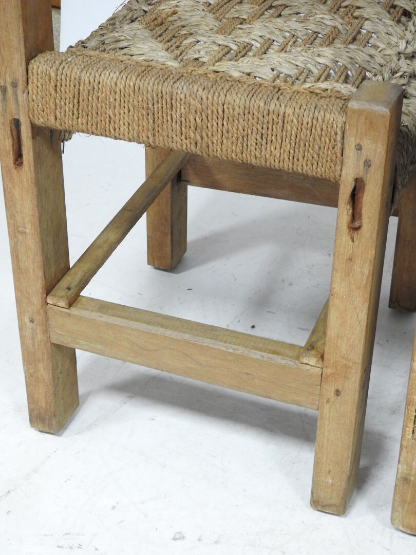 Brutalist chairs in natural wood with woven rush and rope seats.