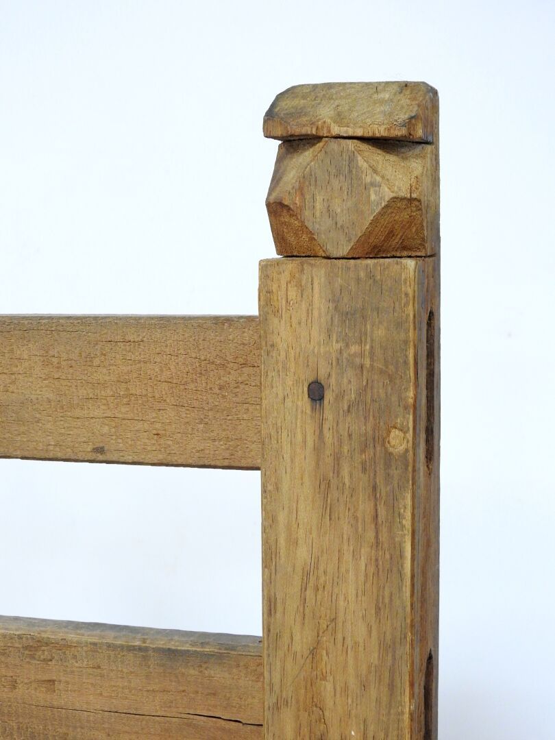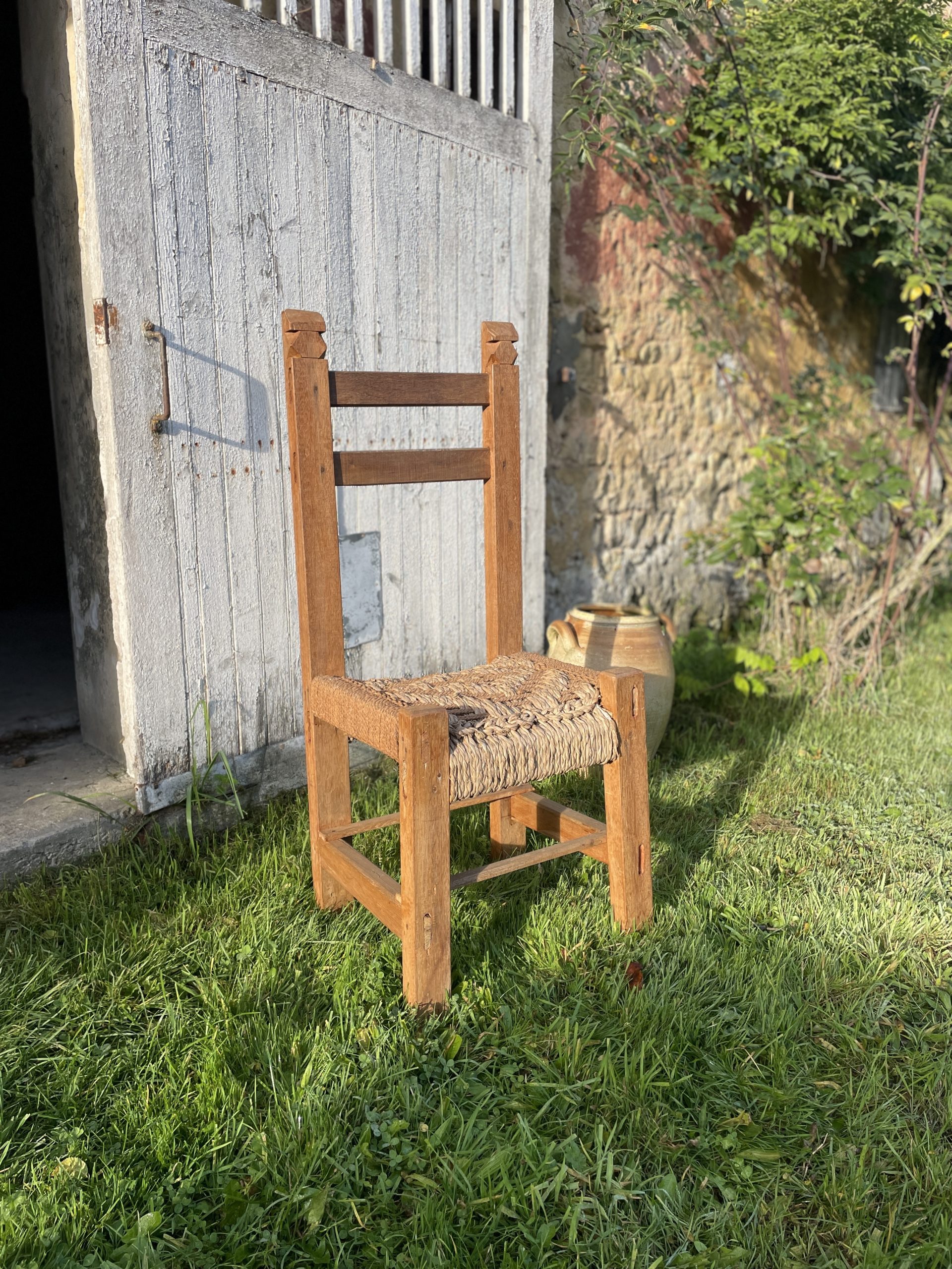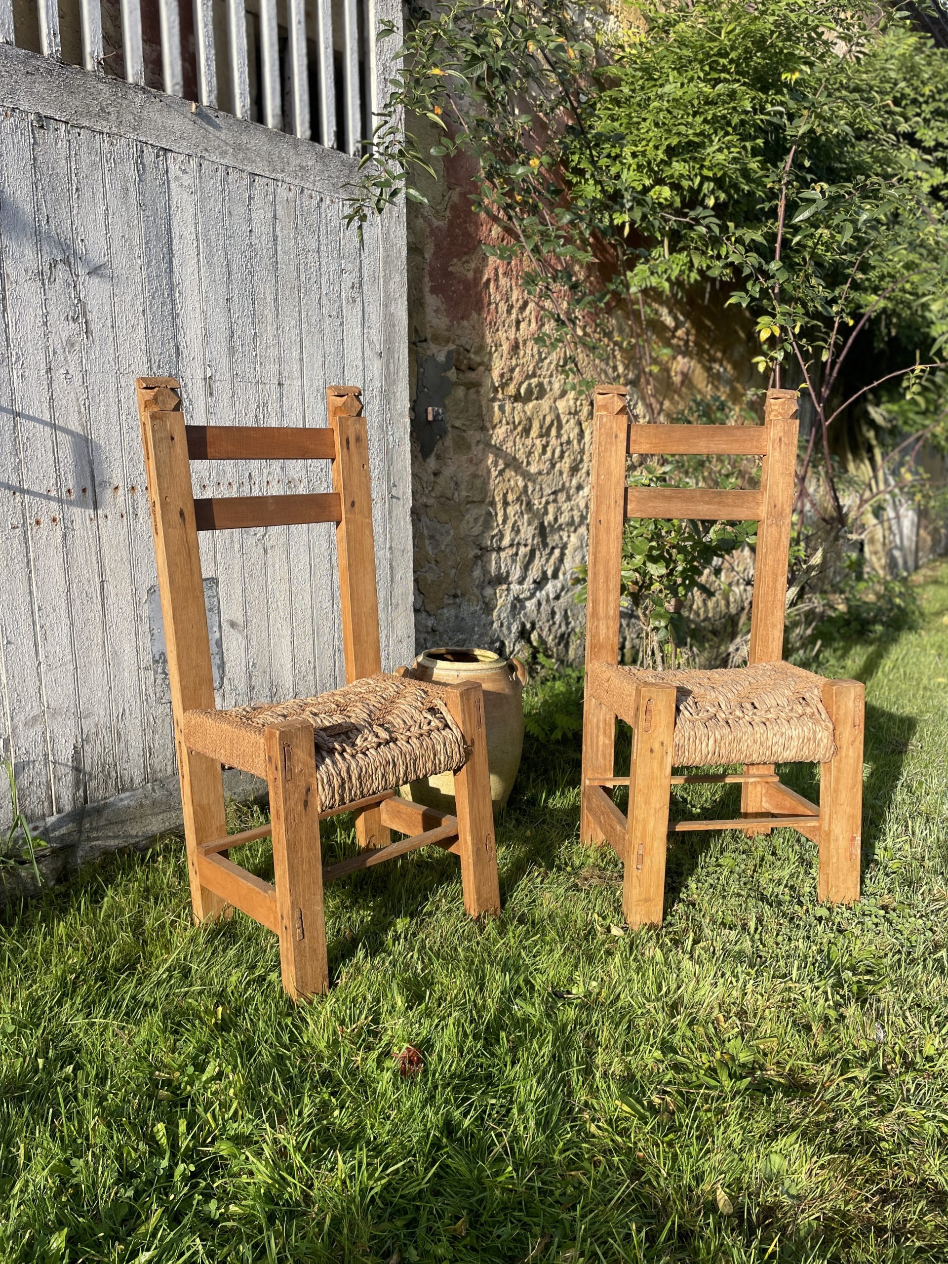 Brutalist chairs in natural wood with woven rush and rope seats.