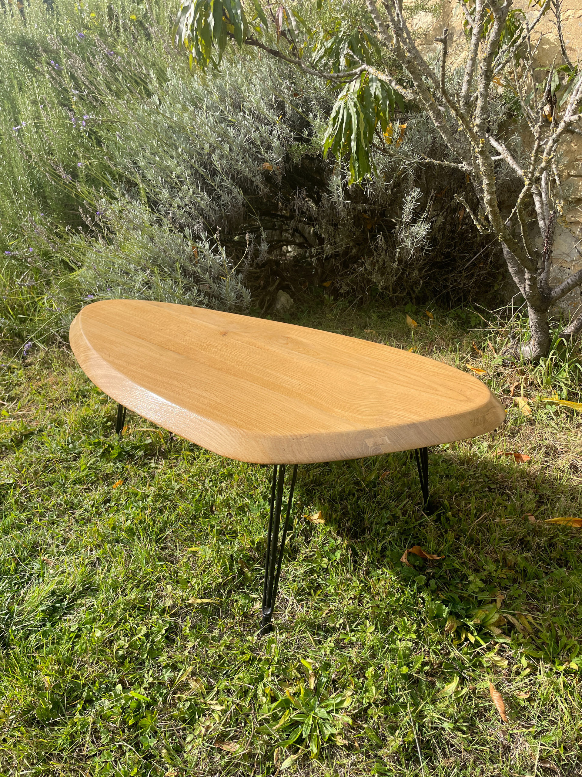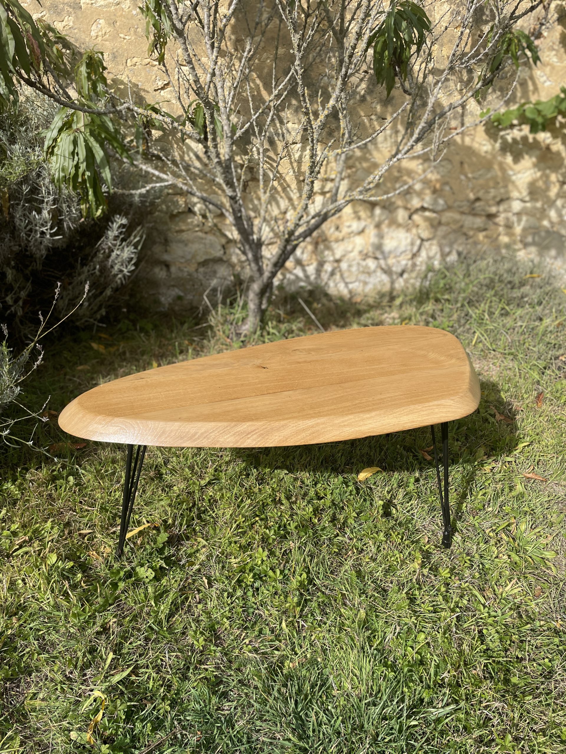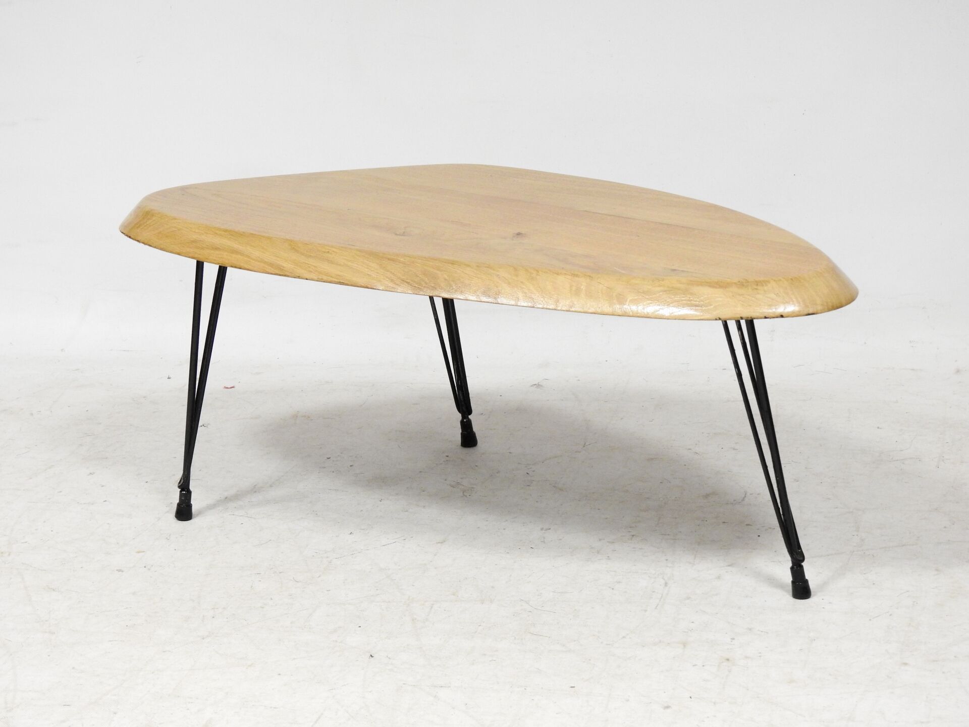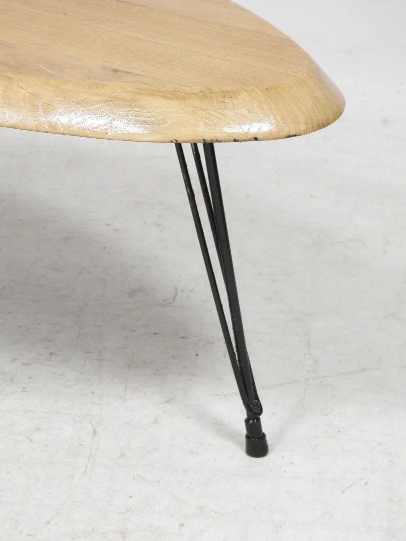 Coffee table with a free-form natural wood top, resting on a black lacquered metal tripod base in the style of Jean Prouvé.
